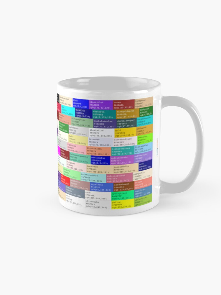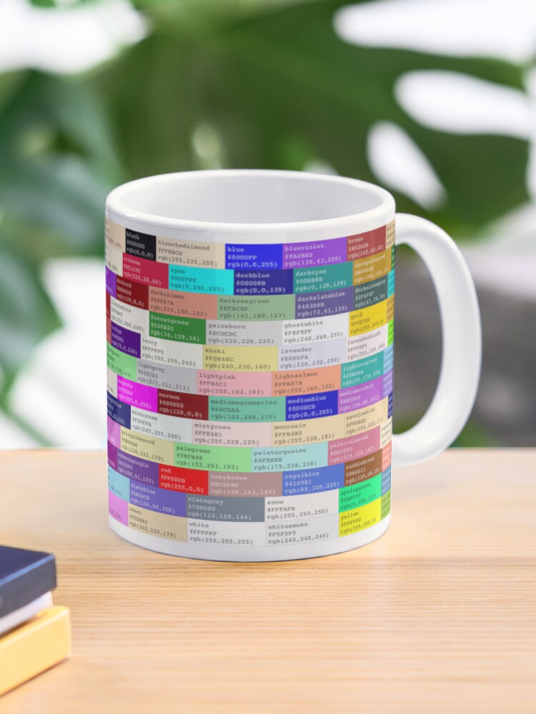 This CSS Colors study mug presents a mosaic canvas of all unique named colors, together with their Hex code and RGB values. A must-have companion on every web developers desk!