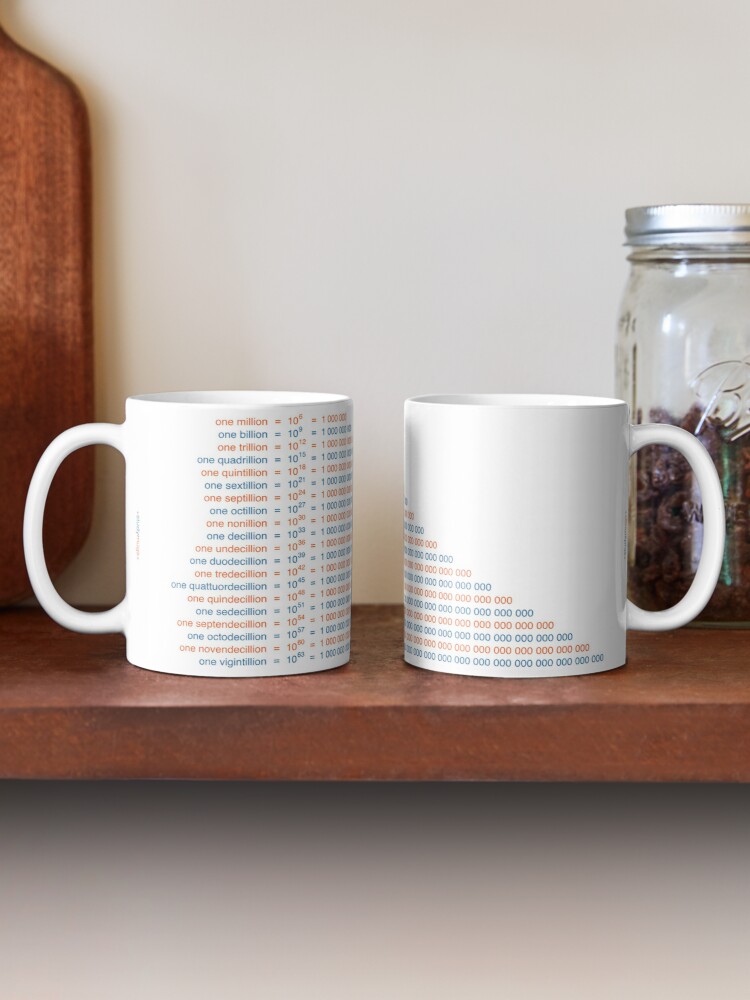 In everyday language, we may rarely encounter values larger than maybe a billion or perhaps a trillion, but that doesn't mean they don't exist! This mug shows you the names of all numbers up to a vigintillion - a 1 followed by 63 zeros!