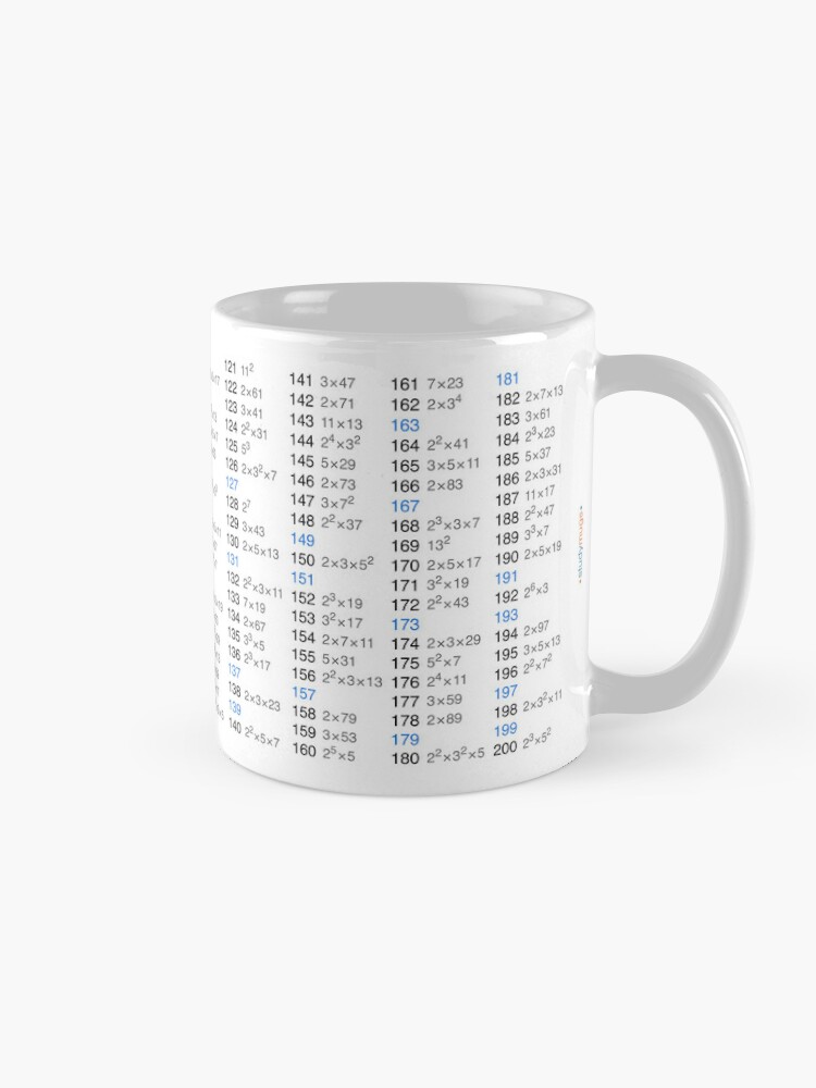 All integers (larger than 1) are either prime numbers or can be expressed as a product of prime numbers. This mug highlights all prime numbers up to 200, and shows the prime factorization of all non-primes.